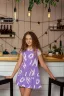 Платье длинной выше колена, с оборкой по низу, с капюшоном из сетки. Рукав короткий из сетки, с фигурным вырезом. Лицевой край капюшона, фигурные вырезы рукавов обработаны бейкой из основного полотна.