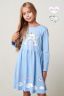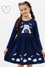 Платье для девочек дошкольного и младшего школьного возраста, из однотонного трикотажного полотна кулирка с лайкрой. Платье прилегающего силуэта, отрезное и расклешенное от линии талии, с втачным длинным одношовным рукавом, с обтачкой в горловине. Низа рукавов и нижней части платья подогнуты. По шву втачивания обтачки в горловину проложена отделочная строчка. Спереди на верхней и нижней частях платья нанесен печатный рисунок.
