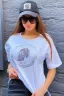 Футболка прямого силуэта, с округлой горловиной, с удлиненной спинкой. Рукав короткий. Горловина обработана бейкой из основного полотна. На полочке эффектная печать в виде черепа из страз.