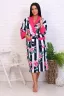 Оригинальный женский халат с красивым принтом на ткани в виде полос и роз. Застегивается на запах с поясом, длина ниже колена