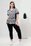 Костюм состоит из туники и брюк. Туника прямого силуэта, с V-образной горловиной, с боковыми вставками из отделочного полотна, с разрезами в нижней части боковых швов. Спинка с кокеткой, удлиненная. Рукав втачной, короткий, с манжетом и хлястом с пуговицей. Горловина обработана бейкой из отделочного полотна. Брюки на поясе, с боковыми карманами, с лампасами из отделочного полотна вдоль боковых швов.