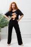 Костюм состоит из укороченной футболки "оверсайз" и брюк. Футболка с округлой горловиной. Рукав короткий, с манжетом. Горловина обработана бейкой из основного полотна. Брюки прямые, на поясе, с боковыми карманами, с накладными карманами по боковым швам.