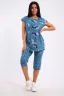 Костюм женский с бриджами из 100 % хлопка. Футболка со спущенным плечом и декоративным карманом. Силуэт полуприлегающий.