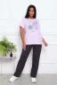Костюм женский: брюки с удобными карманами в боковых швах, с комфортным поясом; футболка с короткими рукавами и стильным принтом с блёстками на полочке.