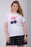 Пижама женская состоит из футболки с коротким рукавом и шортов. Футболка из однотонной кулирки с красивым принтом, шорты свободного покроя из ткани кулирка.