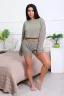 Костюм домашний с шортами из мягкого трикотажа СОТЫ. Комфортный комплект состоит из стильного, укороченного лонгслива с длинным рукавом на манжете и шорт с удобными боковыми карманами. Оригинальный 3Д рисунок, образованный путём сложного переплетения волокон, внешне напоминает пчелиные соты. Полотно мягкое, эластичное и прочное, легко стирается, практически не мнётся, не деформируется.
