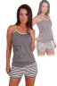 Костюм из кулирки майка + шорты. Серая майка с темными лямками, полосатая окантовка, принт в виде линий. Полосатые короткие шорты, длина выше середины бедра