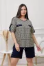 Костюм состоит из туники и шорт. Туника прямого силуэта, с округлой горловиной, длиной до середины бедра. Полочка с кокеткой и декоративными клапанами. Спинка с кокеткой, удлиненная. В нижней части боковых швов обработаны разрезы. Рукав короткий, с фигурными разрезами. Горловина обработана бейкой из отделочного полотна. Шорты "бермуды" прямые, свободные, на поясе, с боковыми накладными карманами. В нижней части боковых швов обработаны декоративные шлицы с отделочными пуговицами.