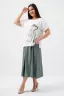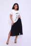 Женская двойка прямого силуэта. Верх комплекта в белом цвете с цветным принтом, короткий цельнокроеный рукав, низ футболки имеет свойство затягиваться, поэтому ее можно носить спущенную на юбку, а можно затянуть и оставить над ней, что подчеркнет вашу талию. Низ - свободная юбка двух цветов, с двумя разрезами снизу. Костюм повседневный и удобный, из легкой ткани сингапур, что хорошо для жаркого лета.