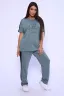 Женский костюм изготовлен из мягкого кулирного полотна, средней плотности. Костюм состоит из футболки и брюк. Футболка с округлой горловиной, обработанной окантовкой, по плечам есть лампасы, по бокам небольшие разрезы. Брюки прямые с лампасами, поясом есть карманы.