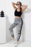Комплект состоит из топа и брюк. Топ на узких бретелях, с округлой горловиной на полочке и фигурным вырезом сзади. Горловина, проймы и вырез на спинке обработаны бейкой из основного полотна. Брюки на поясе, с боковыми карманами, с лампасами из отделочного полотна вдоль боковых швов, на резинке по низу.