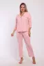 Пижама женская с брюками. Рубашка прямого, свободного кроя на пуговицах с имитацией кармана на груди. Воротник фигурный. Кроя полочки, рукав и воротник обработан внутренней окантовкой. Брюки с карманами, длина по щиколотку.