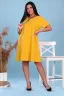 Легкое молодежное платье в ярких летних расцветках. Платье с круглой горловиной, короткий рукав, от линии груди расклешенное. Длина до середины колена. По спинке шов. Аксессуары в комплект не входят. На модели 50 размер.