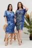 Платье женское полуприлегающего силуэта, рукав цельнокроенный короткий. Полочка состоит из трех частей. Левая боковая часть из контрастной отделочной ткани, сверху расположен нагрудный карман с настроченной на него тесьмой. С правой стороны полочки в горизонтальном шве внутренний карман. Круглый вырез горловины и манжеты рукава окантованы бейкой из отделочной ткани и белым кантом.