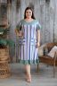 Платье женское полуприлегающего силуэта из ткани в полоску. Рукав короткий цельнокроенный с воланом. На полочке накладные карманы. Кокетка полочки и спинки, воланы рукавов, рюша низа изделия из отделочной ткани. На кокетке полочки и карманах декоративная отделка в виде переплетающейся бейки. На модели 52 размер