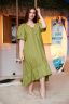 Платье женское, расширенное к низу. Горловина округлая, на полочке имитация планки с тремя пуговицами. Рукав реглан с манжетой и тремя складками. Фигурный низ платья заканчивается широкой рюшей.