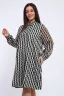 Изысканное женское платье трапециевидного силуэта – воплощение утонченности и комфорта. Воротник-стойка, украшенный кокетливыми завязками, придает образу нотку романтики и загадочности. Легкая ткань мягко струится по фигуре, обеспечивая свободу движений и ощущение невесомости.