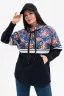 Толстовка женская прямого силуэта, трехцветная. Рукав цельнокроеный со швом. Воротник - стойка с двумя люверсами и декоративным шнурком. Верхняя часть полочки и рукава отделена от нижней светло-серой полосой, на которую настрочена декоративная тесьма. Карман "Кенгуру". Низ изделия фигурный, по бокам разрезы.