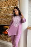 Туника прямая, свободная, с округлой горловиной, с асимметричным низом. Рукав длиной 3/4. Горловина обработана бейкой из основного полотна. Длина рукава указана от горловины. Цвет сиреневый может быть в двух оттенках.