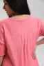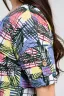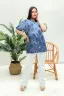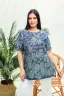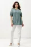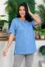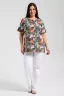 Туника прямая, свободная, с округлой горловиной, с удлиненной спинкой. Рукав короткий, с манжетом и хлястом с пуговицей. В верхней части полочки обработаны декоративные защипы. Спинка с кокеткой. В нижней части боковых швов расположены разрезы. Горловина обработана бейкой из основного полотна.