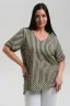 Туника прямого силуэта, с V-образной горловиной, с фигурной линией низа, длиной до середины бедра. Рукав втачной, короткий, с манжетом. В нижей части боковых швов обработаны разрезы. Горловина обработана бейкой из основного полотна.