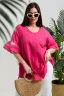 Туника женская, расширенная к низу. Горловина округлая. Рукав реглан, внизу рукава широкая рюша. Низ туники фигурный, в боковых швах внутренние карманы. Свободная, легкая, не стесняющая движений туника незаменима для летнего гардероба любой женщины.